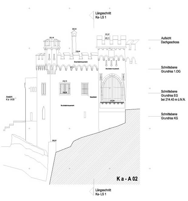 Für die Neugestaltung der Entréesituation bei der Burg Sooneck in Niederheimbach waren für die beteiligen Fachplaner digital verwertbare Bestandsdaten von den betroffenen Gebäudeteilen zu vermessen und als Planzeichnungen anzulegen. Für die Freianlagenplanung wurde die Topographie des Hanggeländes außerhalb der Burg vermessen und als Lageplan sowie digitales Geländemodell aufbereitet.